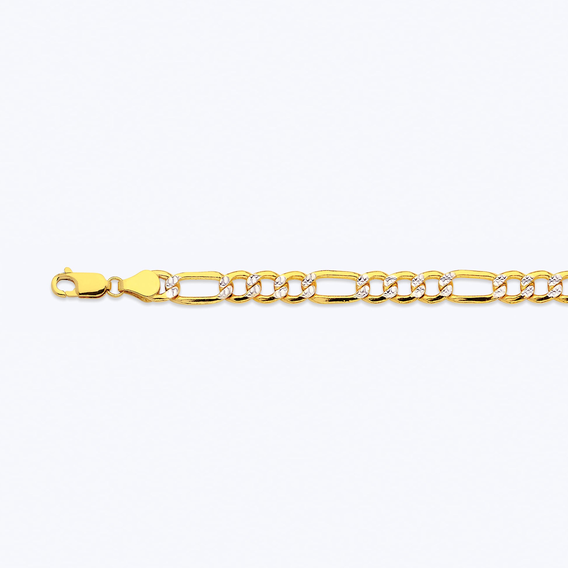 This 10 Karat Yellow Gold Hollow Pave Figaro Chain is a beloved classic worldwide. Made from authentic 10k yellow and white gold, it features two to three small circular links that connect to a long oval link, giving the chain a unique appearance. The center of the curb links is adorned with pave detailing that adds sophistication and elegance to your style. The chain comes in various lengths to suit your preference and weighs approximately 0.56 grams per inch.